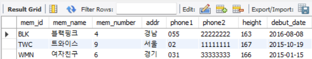 insert into member values('TWC', '트와이스', 9, '서울', '02', '11111111', 167, '2015-10-19'); insert into member values('BLK', '블랙핑크', 4, '경남', '055', '22222222', 163, '2016-8-8'); insert into member values('WMN', '여자친구', 6, '경기', '031', '33333333', 166, '2015-1-15'); insert into buy values(null, 'BLK', '지갑', null, 30, 2); insert into buy values(null, 'BLK', '맥븍프로', '디지털', 1000, 1); insert into buy values(null, 'APN', '아이폰', '디지털', 200, 1); - 출력 화면