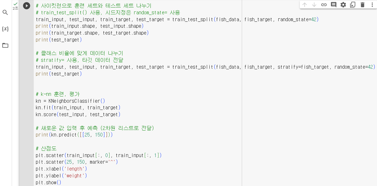 stratify 매개변수로 타깃 데이터 전달하면 클래스 비율에 맞게 데이터를 나누어준다. (훈련 데이터가 작을 때 유용)
