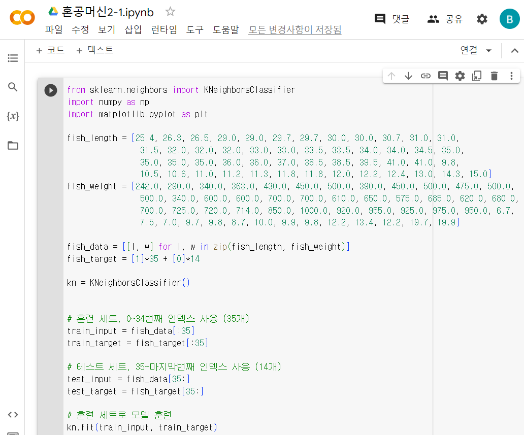 사이킷런 모델의 입력과 출력은 모두 넘파이 배열이다.