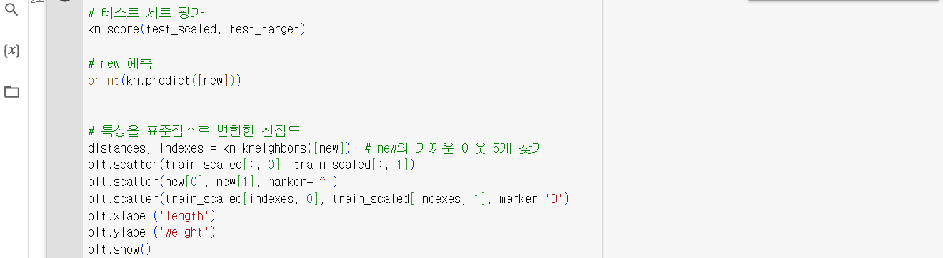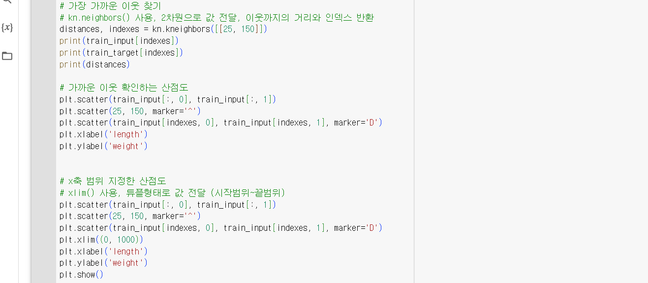 kn.kneighbors(): 2차원 리스트로 값 전달하면 이웃까지의 거리와 인덱스를 반환