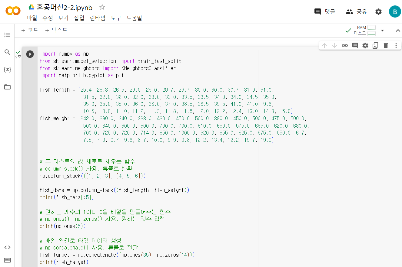 .shape: 배열의 크기를 (샘플 수, 특성 수)로 출력해준다.