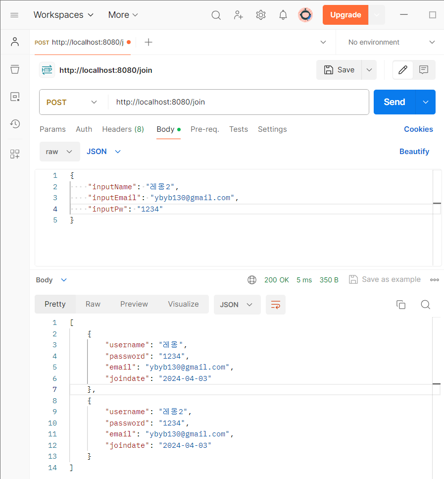 private List<Member> memberList = new ArrayList<>(); // 회원가입 @PostMapping("/join") @ResponseBody public List<Member> join(@RequestBody JoinReqDTO joinReqDTO) { Member member = Member.builder() .username(joinReqDTO.getInputName()) .email(joinReqDTO.getInputEmail()) .password(joinReqDTO.getInputPw()) .joindate(LocalDate.now()) .build(); memberList.add(member); return memberList; }