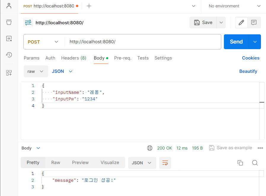 @PostMapping("/") @ResponseBody public Map<String, String> login(@RequestBody LoginReqDTO loginReqDTO) { String message = "로그인 실패!"; String inputName = loginReqDTO.getInputName(); String inputPw = loginReqDTO.getInputPw(); for(Member member: memberList) { if(member.getUsername().equals(inputName) && member.getPassword().equals(inputPw)) { message = "로그인 성공!"; break; } } Map<String, String> loginResMap = new HashMap<>(); loginResMap.put("message", message); return loginResMap; }