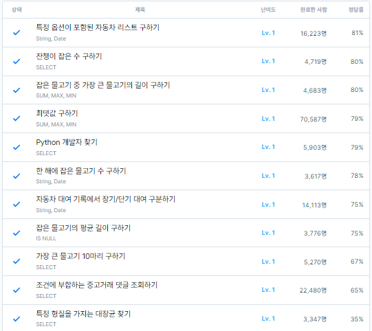 우선 만만한(?) SQL 레벨1부터 모두 채웠어요!