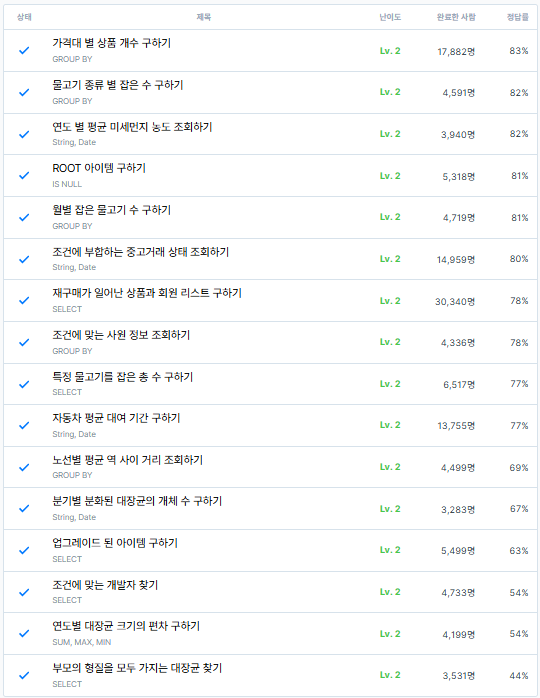 | [SQL] 프로그래머스 Lv.1 풀며 정리했던 연산자, 함수들 (0) | 2024.08.26 |