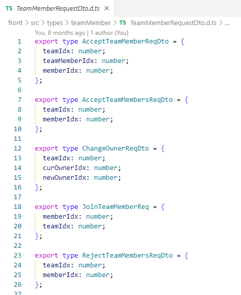 1-1. 백엔드 API 만들 때 dto 클래스 작성했던 것을 모두 타입 정의를 해줘야 한다.